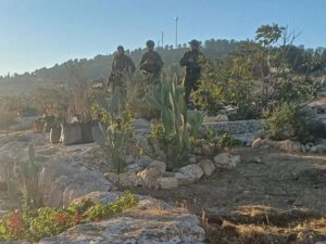 Später eine weitere Situation mit Siedlern auf dem Feld: Siedler kommen mit ihren Tieren, um die Olivenbäume der Palästinenser*innen zu zerstören, die Armee kommt zur selben Zeit (als hätten sie sich abgesprochen) um uns vom Filmen abzuhalten. Das zeigt auch, wie viel ihnen an dem Land liegt, was sie für sich beanspruchen. Ich spüre wie ich noch sehr eingeschüchtert in diesen Situationen agiere.